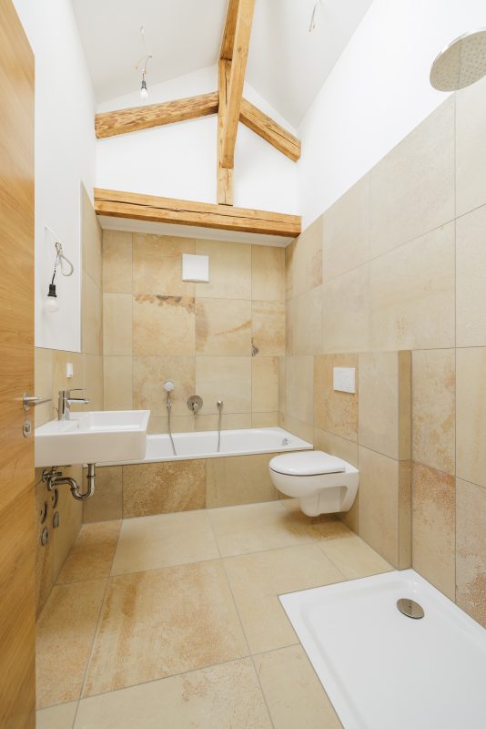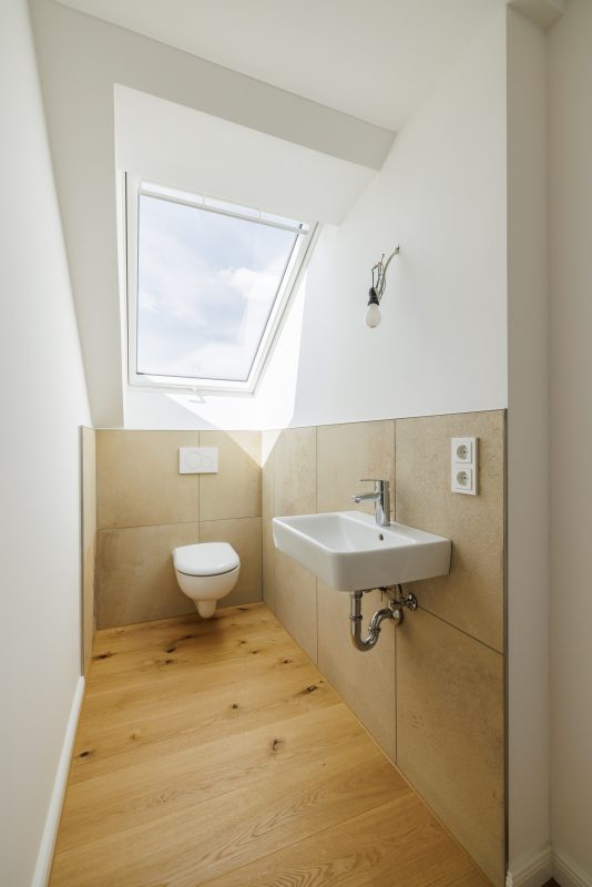 - Masterbad mit Badewanne, WC, Waschbecken und Rain-Shower-Dusche und elektrisch bedienbares Dachflächenfenster