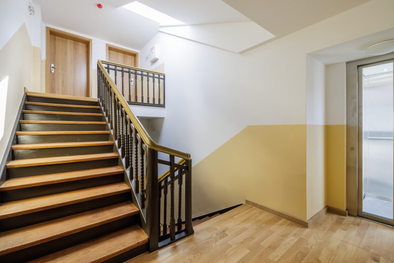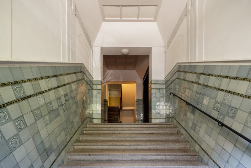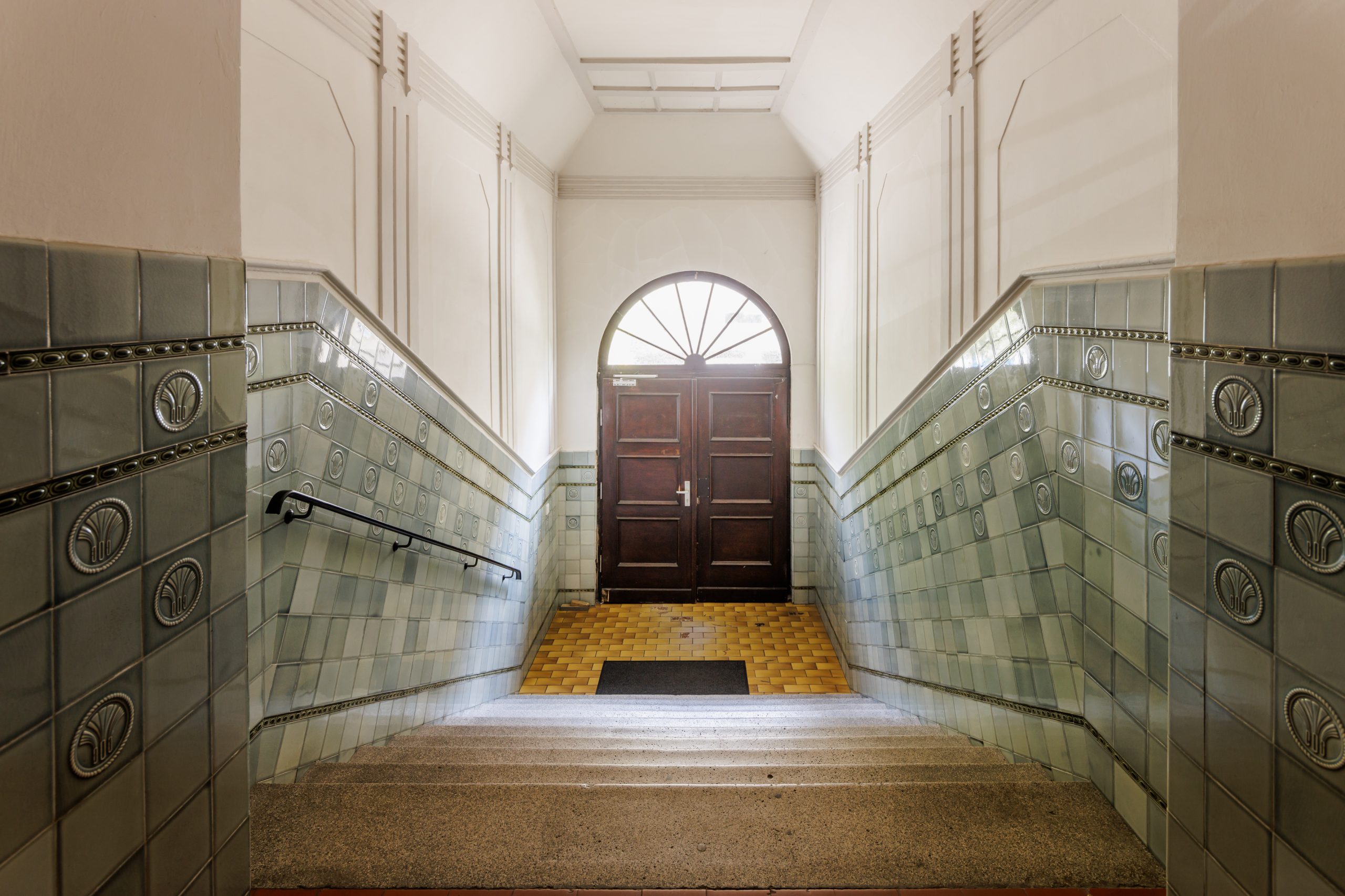 Sie betreten das Gebäude über einen eindrucksvollen Eingangsbereich mit einem original erhaltenen Treppenhaus. Ein neu angebauter Glas-Lift bringt Sie bequem ins oberste Geschoss. Der Lift hält im Zwischengeschoss und es gibt noch einige wenige Stufen zu bewältigen.