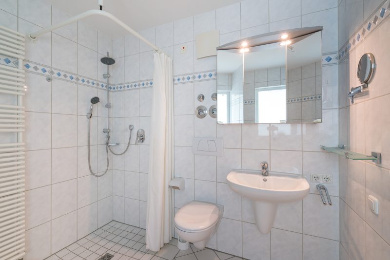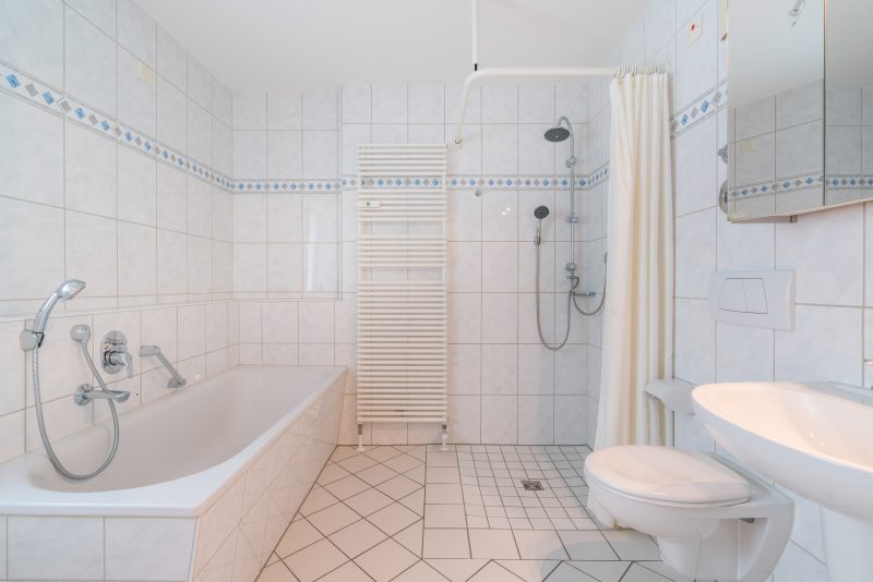 – Bad barrierefrei mit Badewanne, Wandstangen, überfahrbaren Duschtasse, WC, Waschtisch mit Halbsäule, Spiegelschrank, Handtuchheizkörper, Anschluss für Waschmaschine