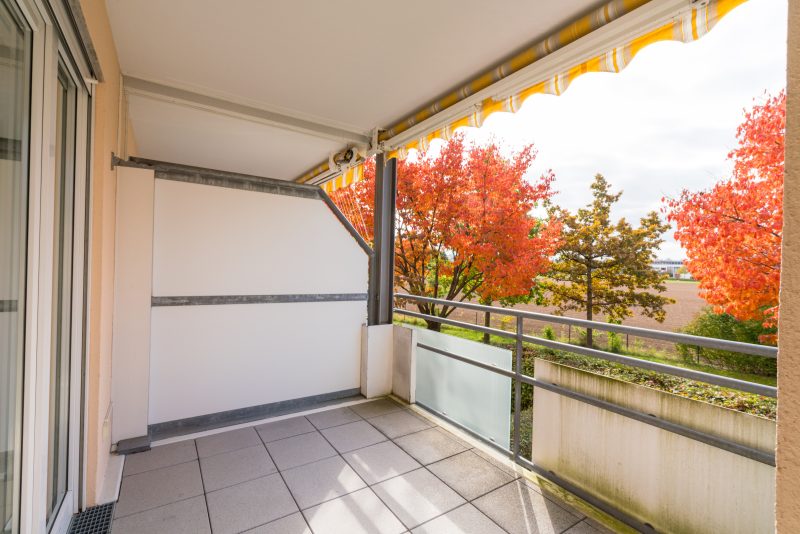 – Großer überdachter Balkon mit Fliesenbelag, elektrischer Markise und Außensteckdose