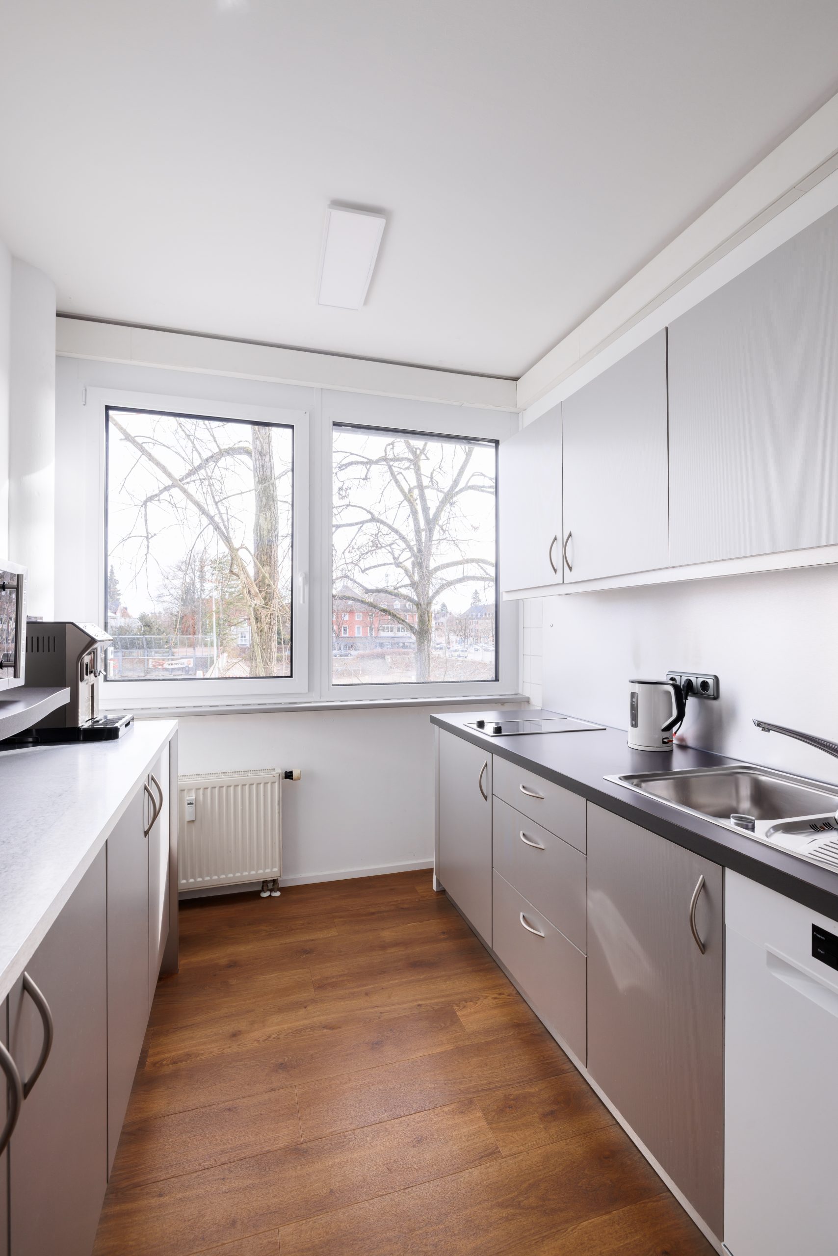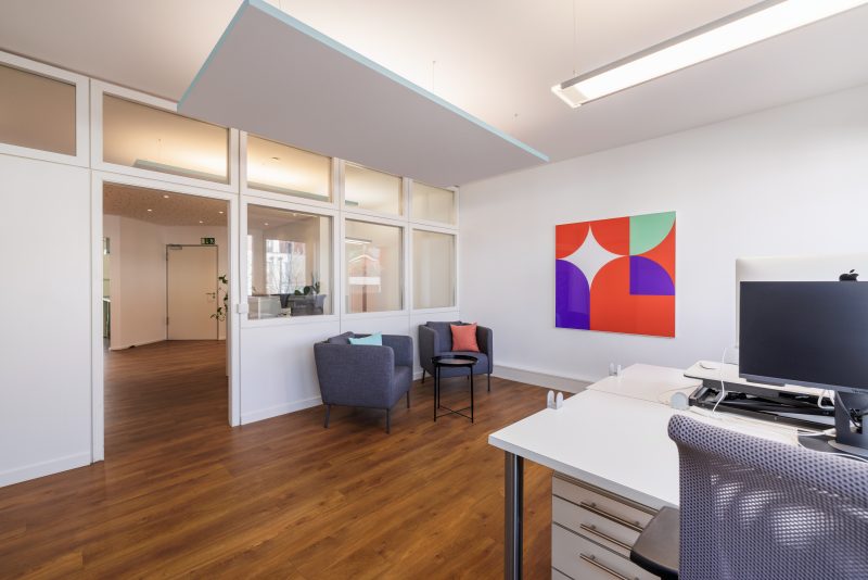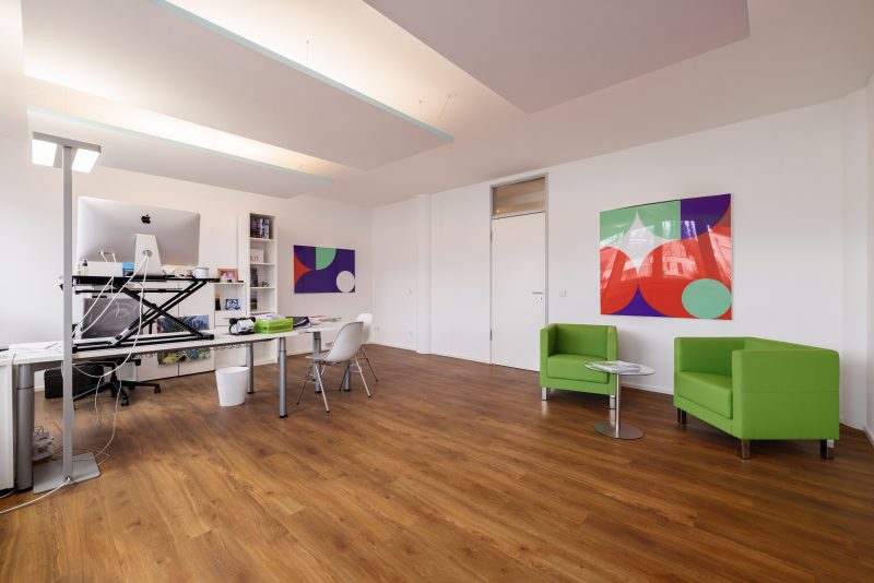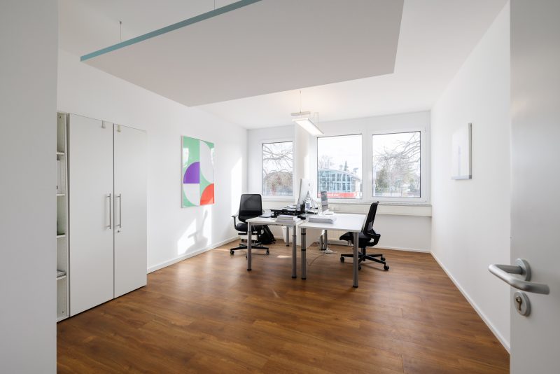 Die Büroeinheit ist in neuwertigem Zustand und wie folgt ausgestattet:1. Fußböden– Durchgehend schwellenlose Verlegung von hochwertigem Vinylboden in Holzoptik dunkel, kratzarm2. Innenausbau– Errichtung neuer Trockenbauwände– Anbringen von Akustikdecken sowie Dämmungen– Deckensegel farblich abgesetzt– Deckenspots als Beleuchtungssystem in Akustikdecken– Einbau zusätzlicher Glaselemente in den Büros für Lichtdurchflutung3. Leuchtsysteme– Deckensegel LED Panel (LEDVANCE)– Einbauspots LEDVANCE– Theke Pendelleuchte Deko-light– Stehleuchten Ideal Lux EMINENT (zwei Büros)– Wandleuchten up and down (Konferenzraum)4. Möblierung: Schreinermöbel – individuelle Anfertigungen, eigene Fertigung– Offener Garderobenschrank (Echtholz furniert)– Sideboard (Echtholz, furniert)– Aufsatzplatte Empfang (Eiche massiv)– Thekenbau (massiv und furniert)– Barbestuhlung, Sofa und Sessel– große Teeküche mit 2 Küchenzeilen mit Unterschränken, Kochfeld, Geschirrspülmaschine, Spülbecken und Oberschränken sowie freistehendem KühlschrankFür die Einrichtung und Ausstattung der Büroeinheit wünscht der Vormieter eine Ablöse. Näheres auf Anfrage.Das Gebäude ist ausgestattet:– Fenster: weiß mit Isolierverglasung– Sonnenschutz: elektrische außenliegende Jalousien– Personenaufzug– Tiefgarage (2 Stellplätze – kein Duplex)Die Miete beträgt:Miete netto 4.200,- €zzgl. 2 Stellplätze TG 100,- €HZ-VZ 220,- €BK-VZ 580,- €Warmmiete: 5.100,- €Zzgl 19 % MwSTBrutto Warm Miete 6.069,- €LAGE
