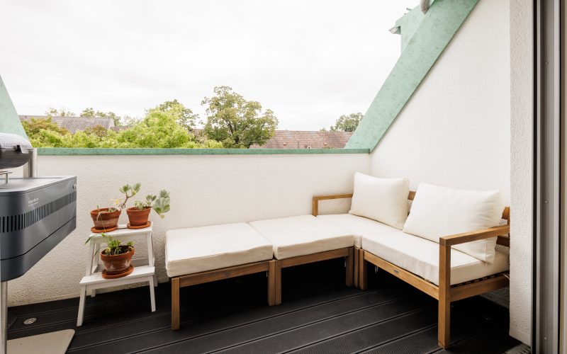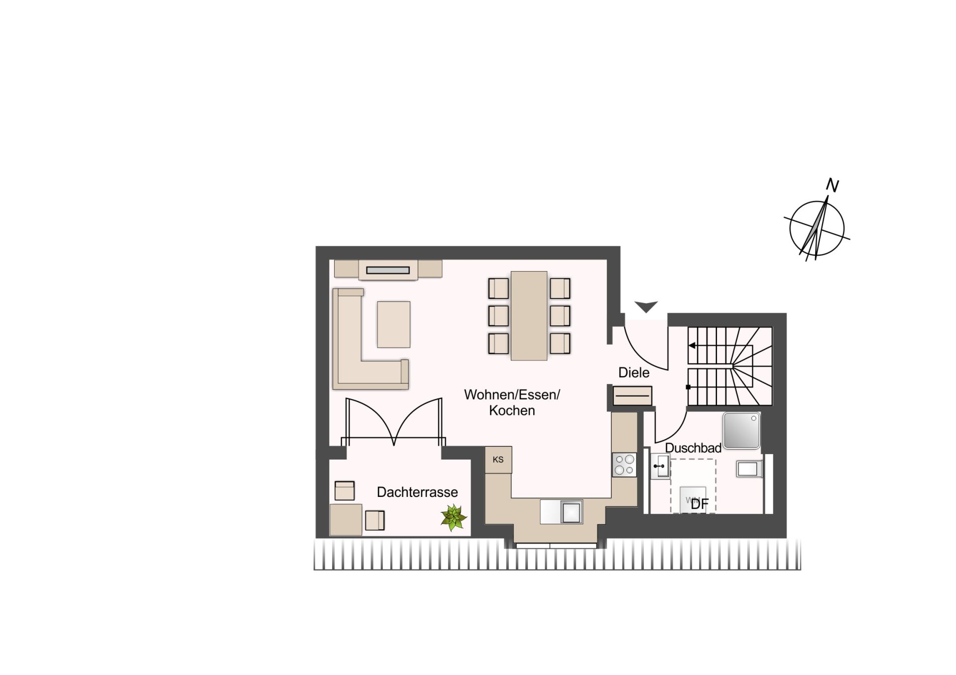 Der Zugang zur Wohnung erfolgt über das 3. Obergeschoss. Auf dieser Ebene befindet sich eine offener Wohn-Essbereich mit integrierter Küche sowie ein Duschbad. Eine nach Süden ausgerichtete Dachterrasse schließt direkt an den Wohnraum und lädt zum Sonnen und Grillen ein.