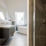 - Bad 2: großformatig gefliest, bodengleiche Dusche mit Rainshower, Duravit XViu Doppelwaschtisch mit Unterschrank, Wandarmatur Grohe, Spiegel, freistehende Badewanne von Ideal Standard, Handtuchheizkörper